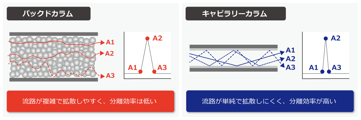 現在主流となっているのはキャピラリーカラムですが、目的に応じて、パックドカラムが用いられるケースもあります。